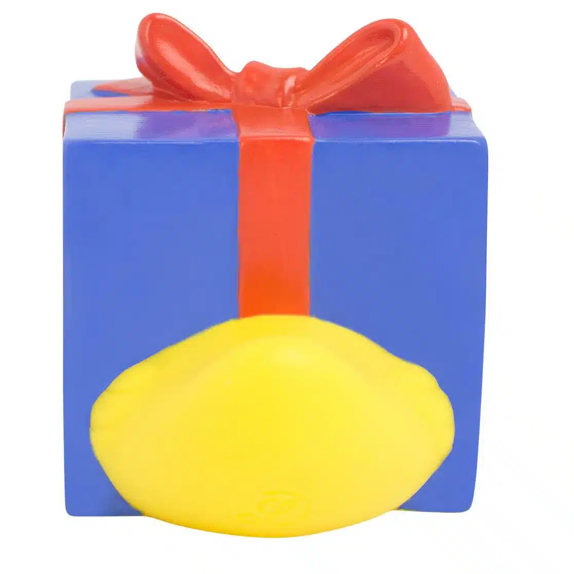 Een rubber eendje in cadeauverpakking! Dit badeendje zit verstopt in blauw cadeaupapier met een rood lint. Een leuke verrassing voor een verjaardag.